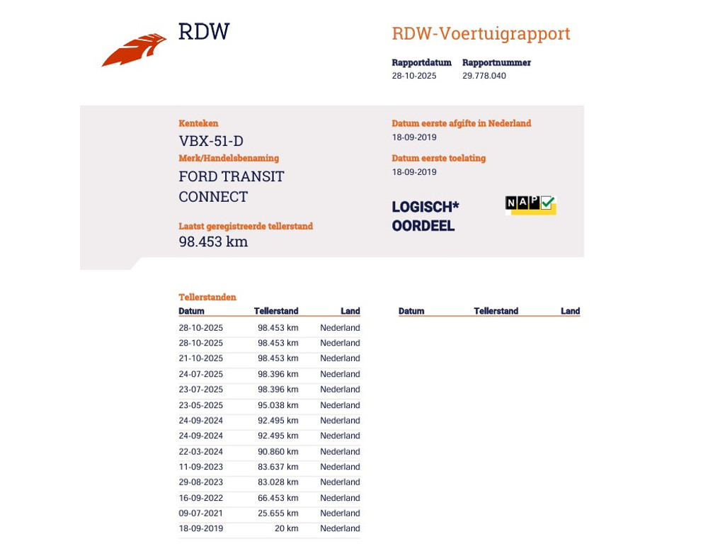 Er is ook een tellerrapport van Nationale Autopas, dat geeft u zekerheid over de kilometerstand van deze auto. Bent u nieuwsgierig naar deze Ford Transit Connect? Laat het ons dan snel weten.